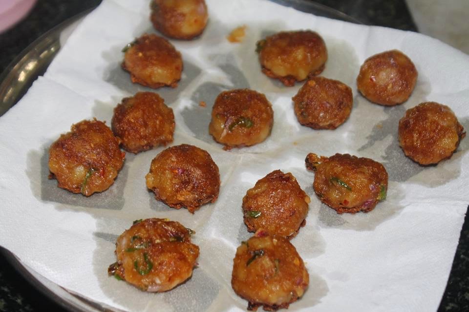 In a shallow pan, put the oil and when it heats up, lower the flame and put the balls carefully. Fry till golden brown and remove it on to a kitchen towel.
